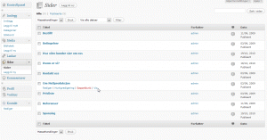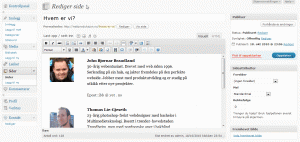 Her er da en liste over de sider som er aktive på din nettside. I dette tilfellet er det selvsagt ikke dine sider, men Nettproduksjon.no sine sider. I din oversikt er det din liste. Ved å trykke på tittelen til sidene, vil du få opp den enkelte side, og kan redigere. Vi trykker i dette tilfellet på «Hvem er vi»: